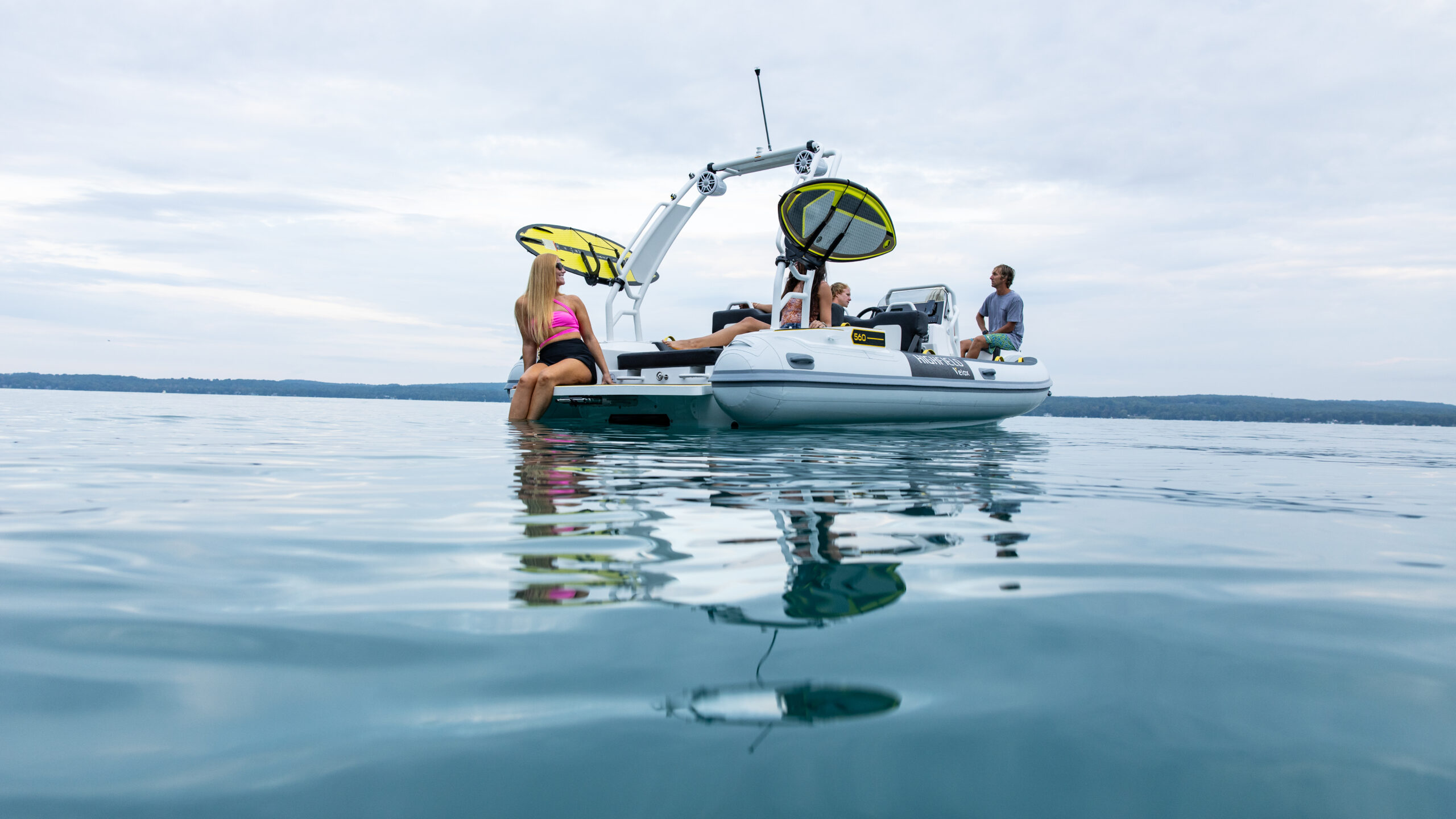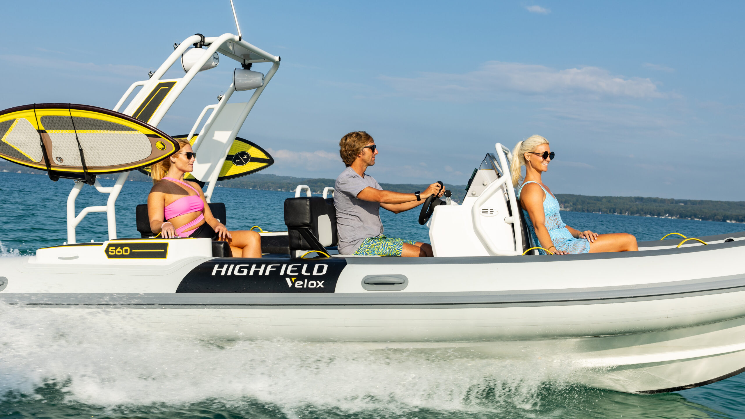 What’s more fun than a traditional jet boat? A RIB jet boat! At nearly 20 feet in length, this jet-powered RIB combines thrilling performance with a stable ride equally suited to adventures on the lake or along the coast. Its rugged aluminum hull easily stands up to beaching on a sandbar. The Velox 560 is offered with Rotax jet options ranging from 170 hp to an eye-watering 300 hp. Featuring a standard helm console with carbon fiber dash, it has stylish seating areas in the bow and cockpit as well as a rear-facing seat for watching friends and family shred the wake. Options include roll bar, rockin’ sound system, tower speakers and custom trailer.